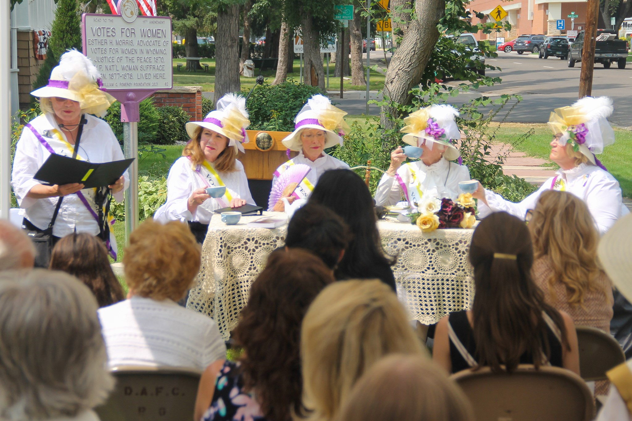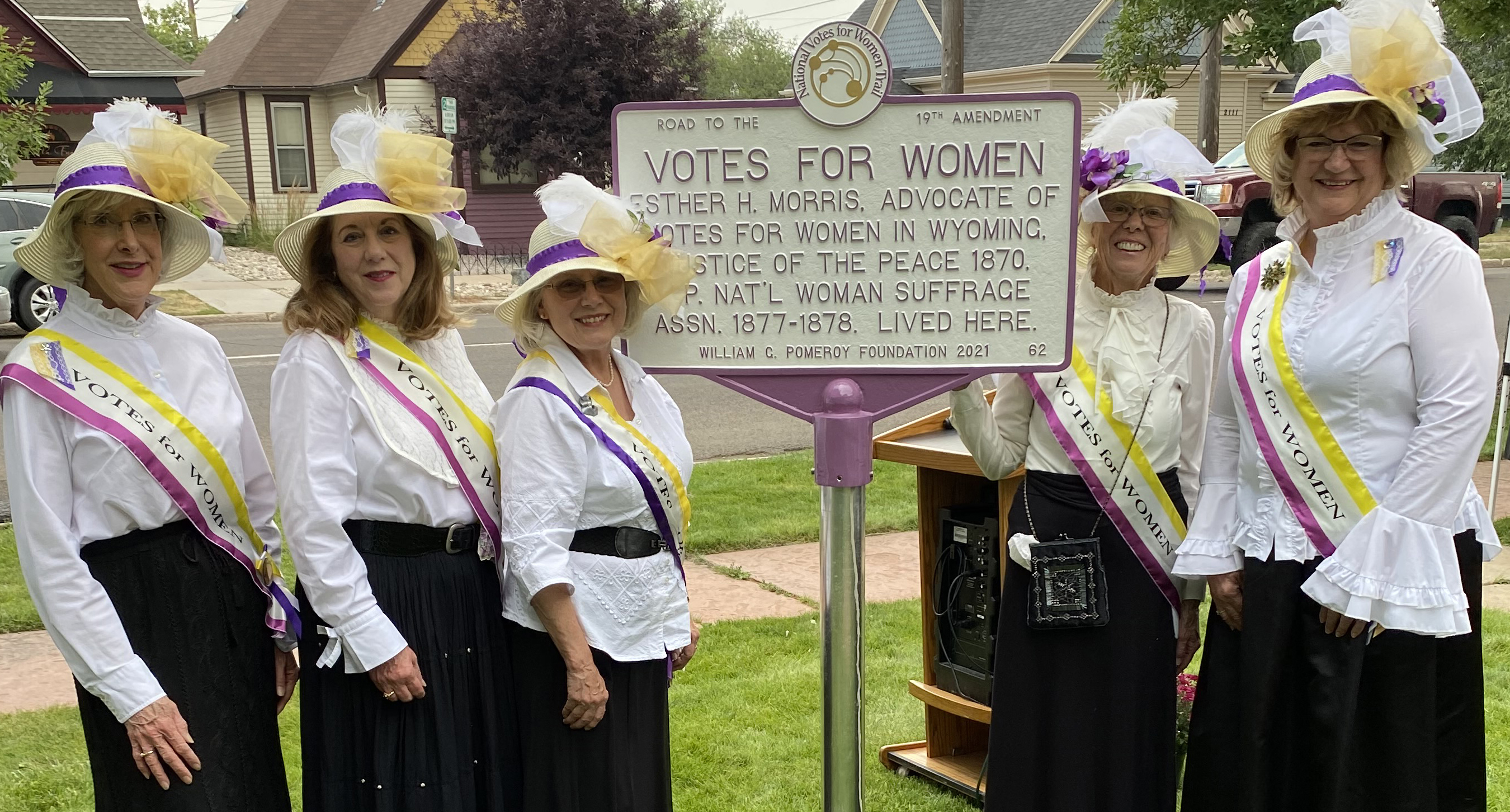 A League of Her Own acting troupe, sponsored by the Cheyenne League of Women Voters, was featured at a dedication of a plaque marking the Cheyenne home of Esther Hobart Morris on August 9, 2021. The Wyoming Secretary of State’s office in conjunction with the Governor’s Council for Women’s Suffrage Celebrations, the William G. Pomeroy Foundation and the National Collaboration of Women’s Historic Sites sponsored the dedication at the Morris house, 2114 Warren Avenue.