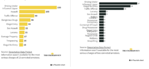ICE also reports that the most serious crimes are DUIs. In early 2024, there were more reported serious crimes than in previous years. Spreadsheets with migrant data are available online. The charts show data from Colorado (left, yellow) and Wyoming (right, black).